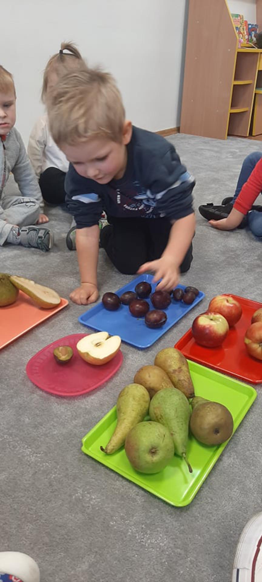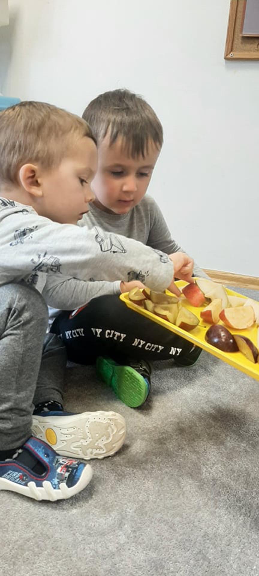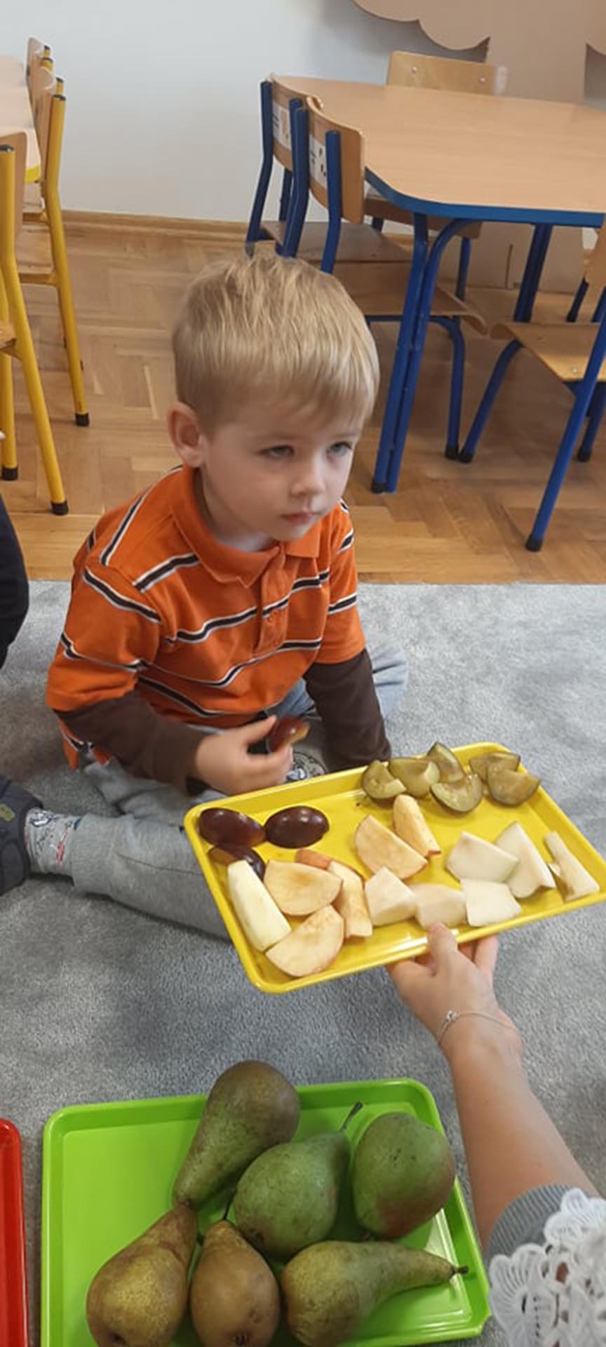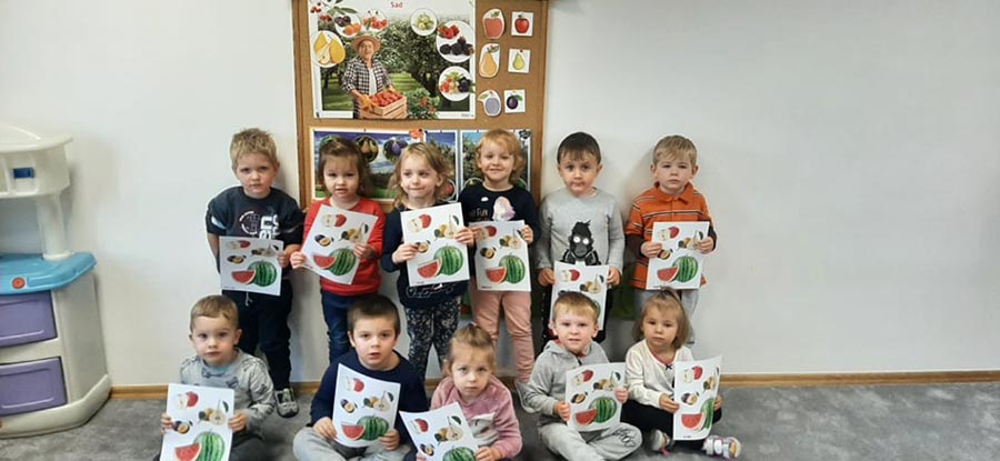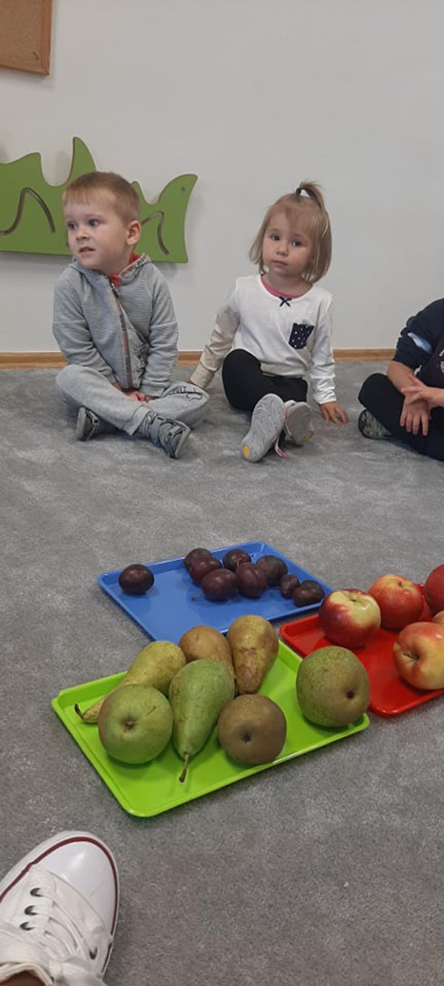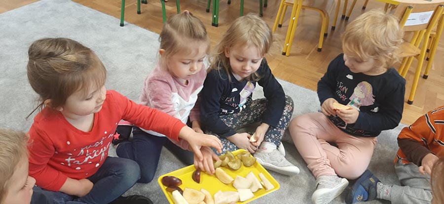 Wspólne urządzanie wystawy owoców w kąciku przyrody, oglądanie i nazywanie owoców przyniesionych przez dzieci. Nauka piosenki Małe czerwone jabłuszko.