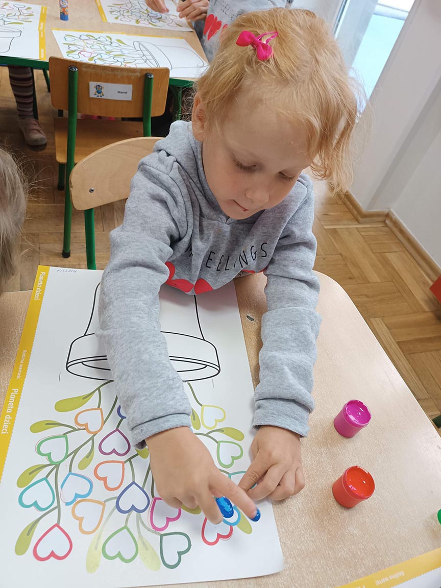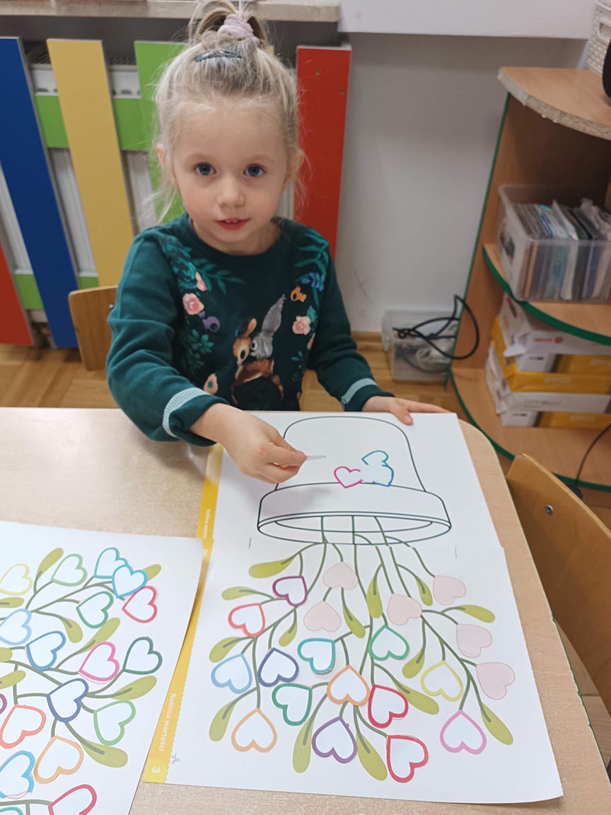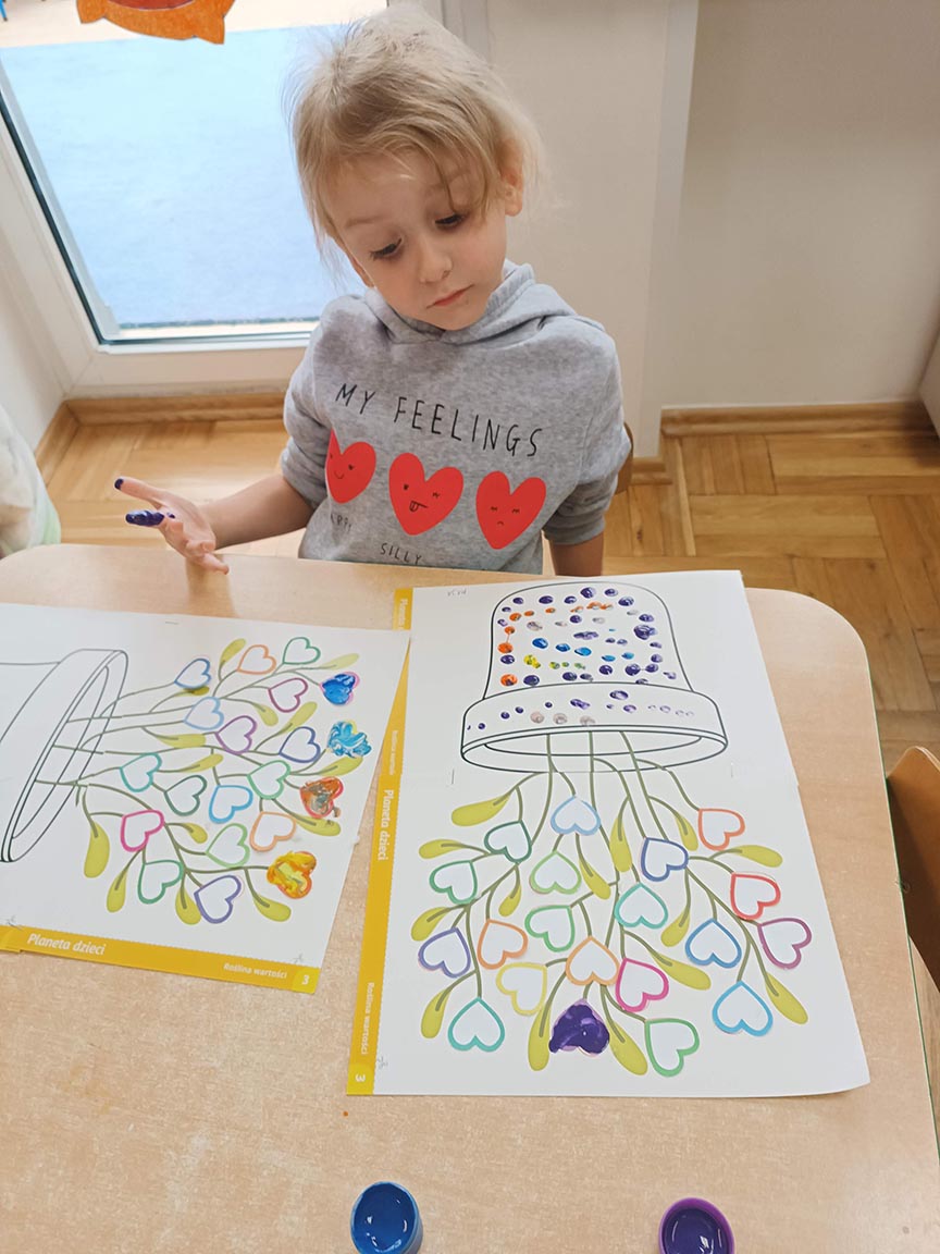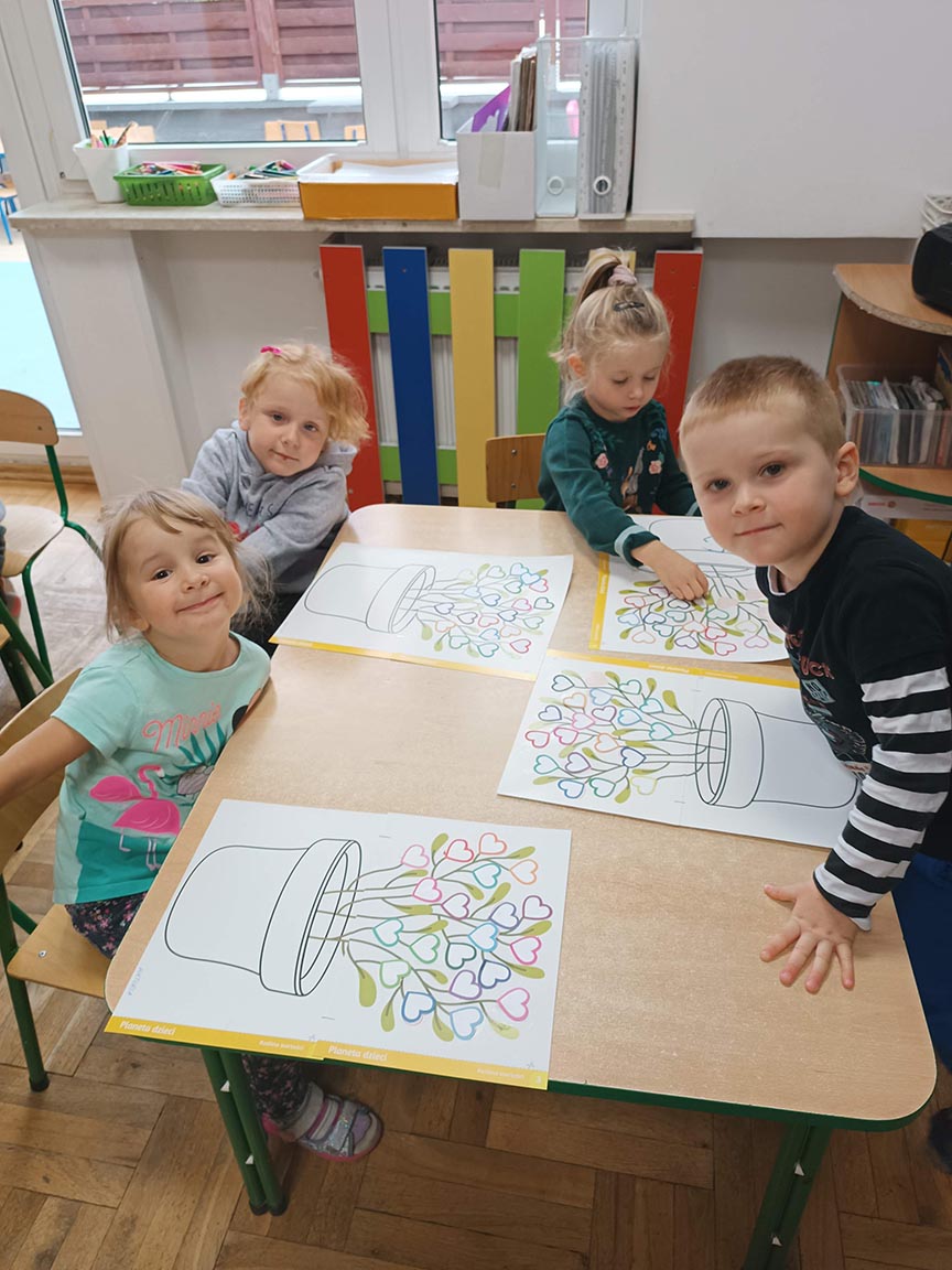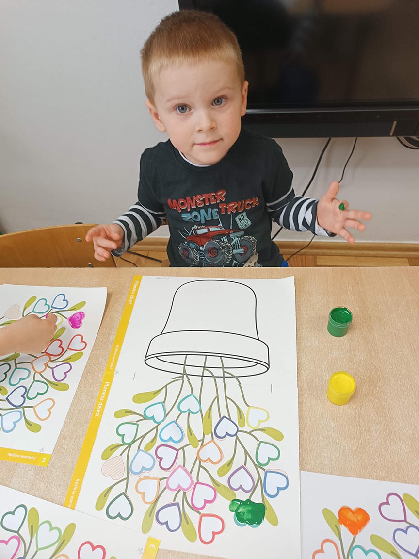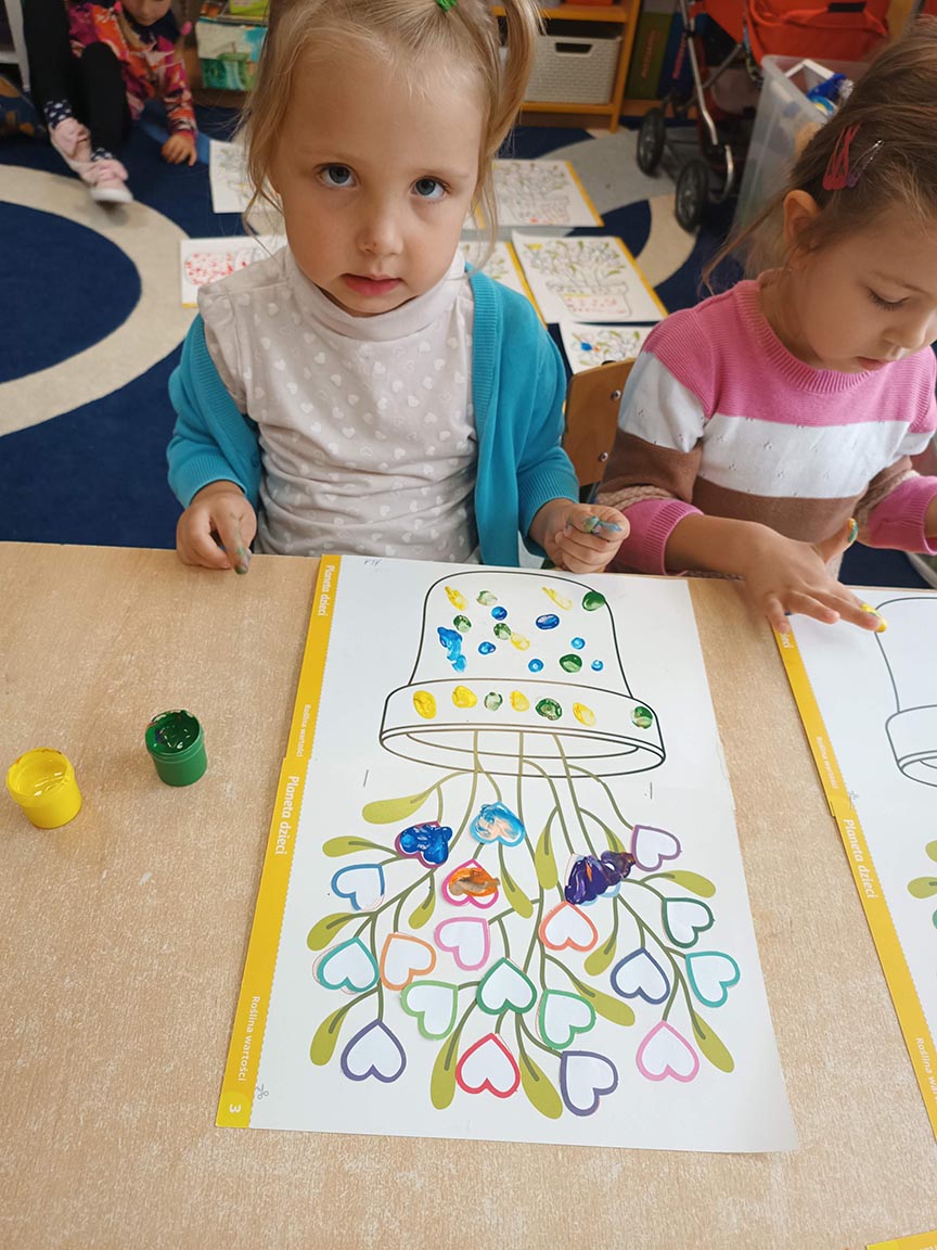 Zajęcia społeczne obejmujące zagadnienia przyjaźni, odwagi, pracowitości, uprzejmości, wolności, cierpliwości, szacunku, co dwa tygodnie dzieci będą poznawać nową wartość zamalowując jedno serduszko na swoim drzewku.
